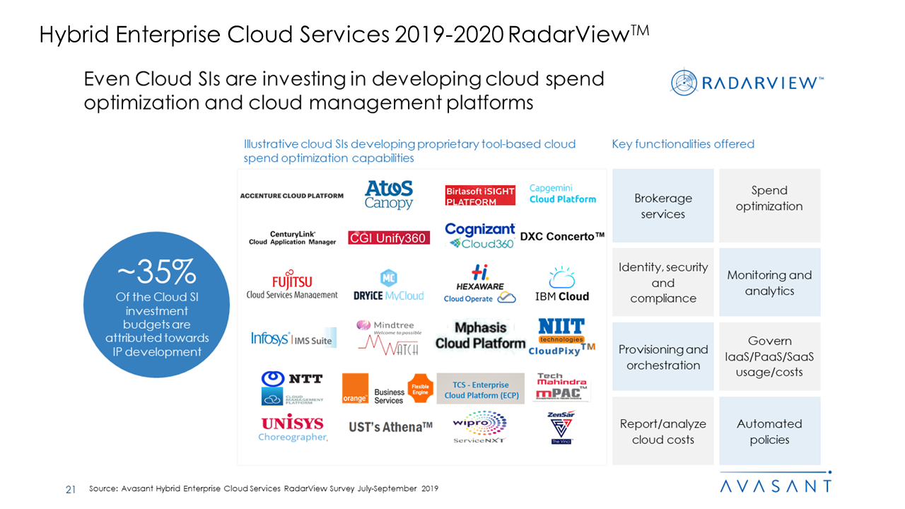 With enterprises becoming more aware of the need for IT environment modernization to enable true digital transformation, there has been a sustained increase in the adoption of hybrid cloud strategies over the last 12 months. With the increasing maturity of hybrid environments, the focus has now shifted from migration to optimization. Avasant’s ongoing interactions with digital leaders highlight that multi-cloud deployments have become a standard part of enterprise IT strategy, with more and more enterprises also looking to move critical industry-specific functions to public clouds. Consequently, cloud management platforms (CMPs), which help to port, govern, and optimize multi-cloud environments easily, are becoming an essential part of the enterprise IT toolkit.