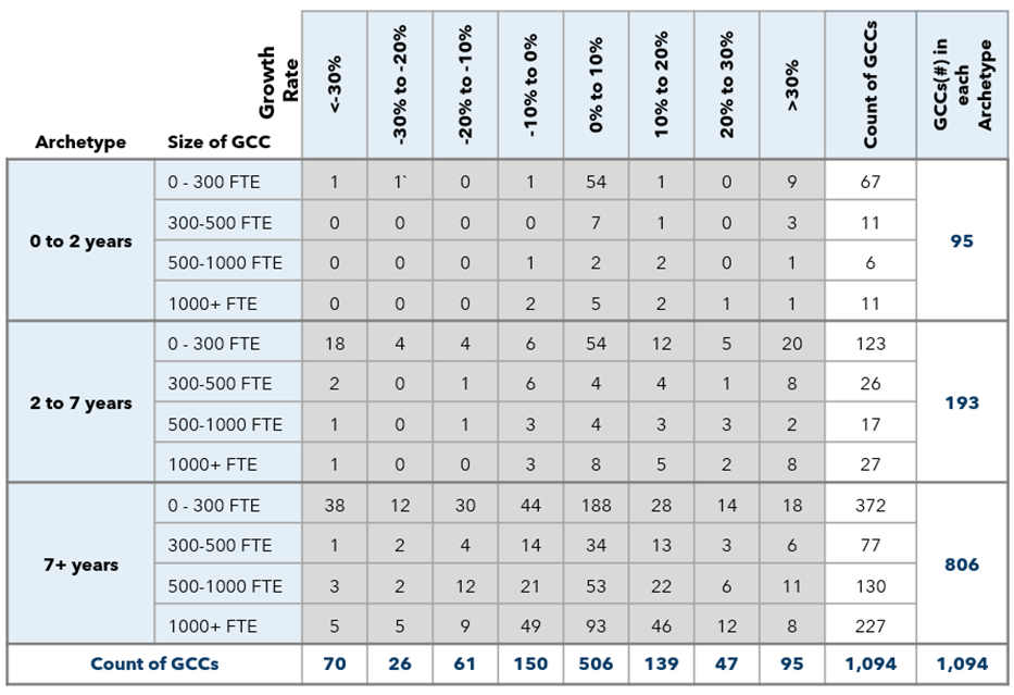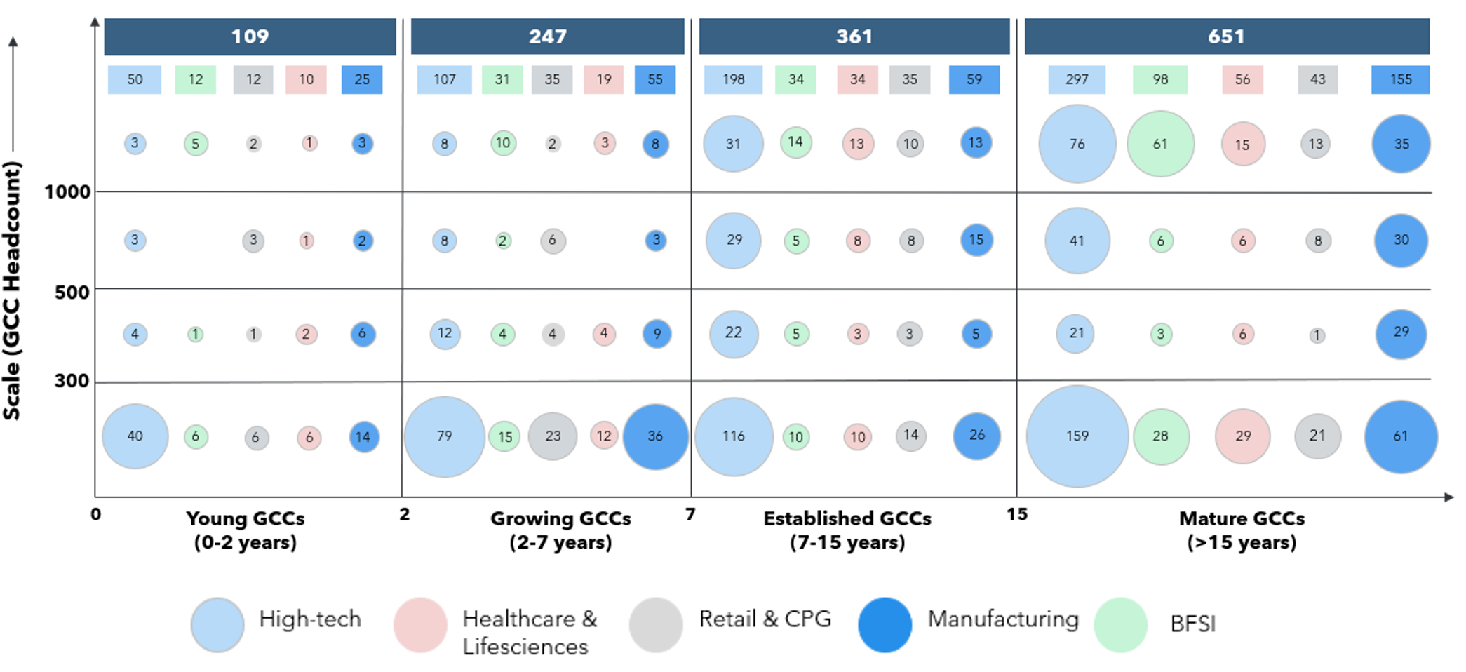 A closer look at the 1,094 prioritized GCCs reveals compelling patterns. Nearly 60% of these centers have been in operation more than seven years, underscoring their operational maturity—but also highlighting a growing need for reinvention and value re-alignment. In fact, more than 650 GCCs have crossed the 15-year threshold, forming a sizable legacy base now facing pressure to transform or monetize.