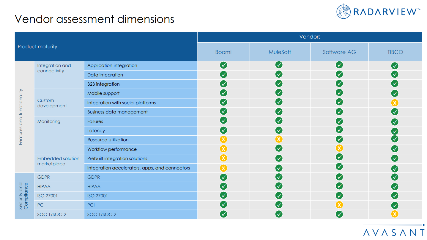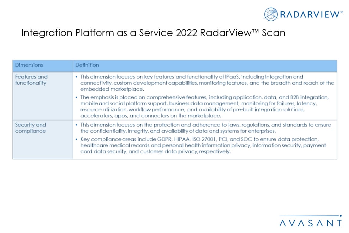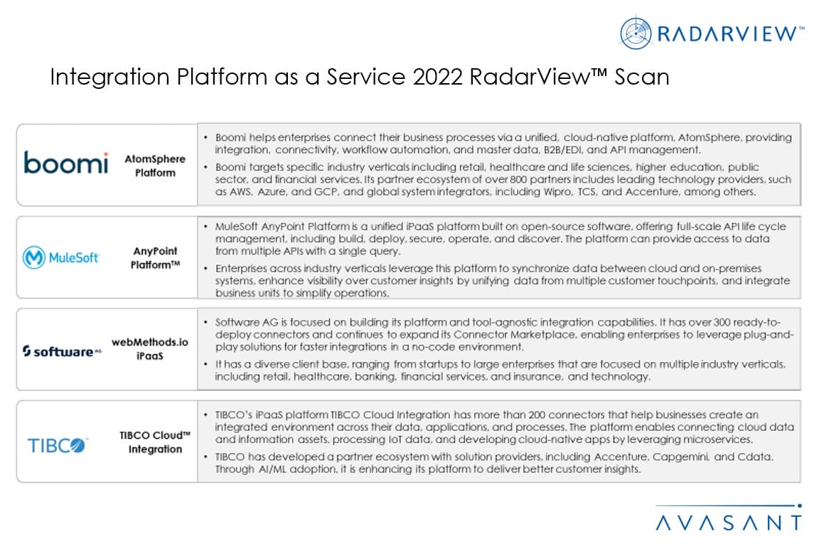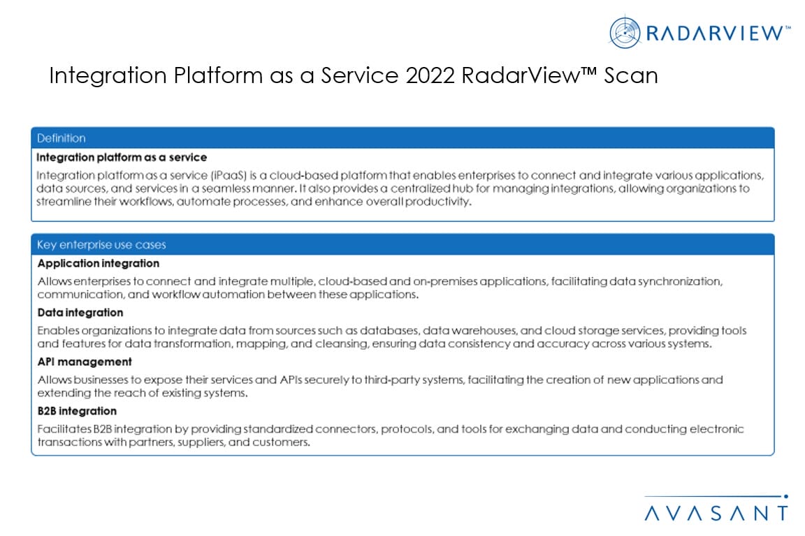 • Avasant’s Integration Platform as a Service 2022 RadarView Scan assesses vendors across two dimensions
