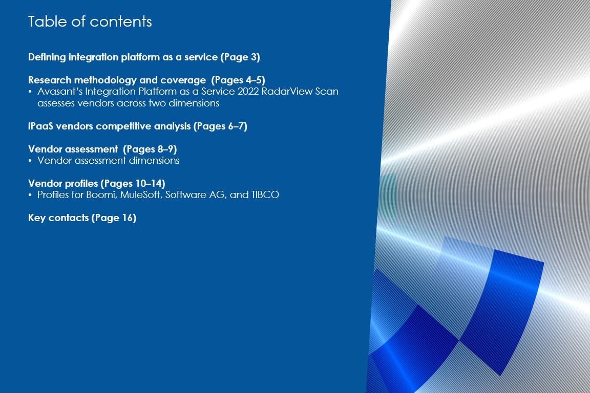This RadarView Scan provides key information on vendors that offer integration platform as a service (iPaaS). The report begins with the definition and key enterprise use cases of iPaaS. It then highlights and compares the functionality offered by four vendors for addressing multiple business challenges.