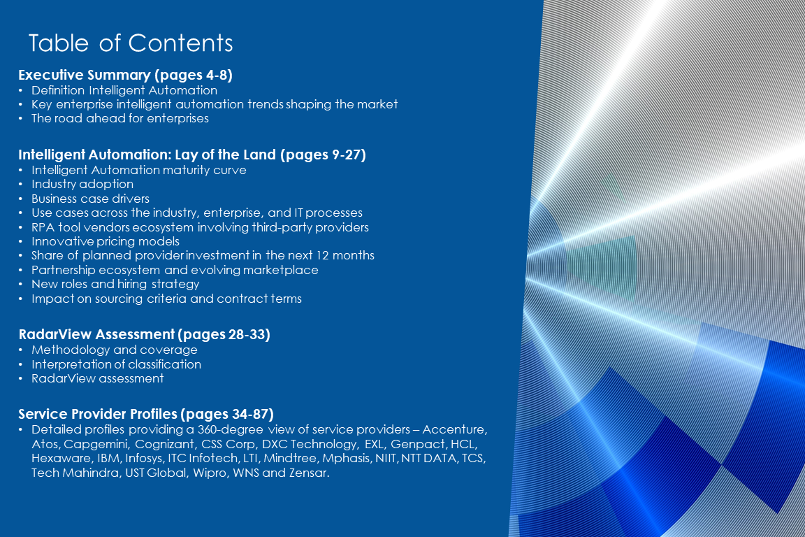The report covers top-tier managed service providers globally which are supporting the enterprise adoption of intelligent adoption, addressing different aspects of the value chain, current adoption state, technology landscape with special emphasis on industry-specific adoption, business case drivers, emerging new use-cases across the industry, enterprise and IT process, RPA tool provider ecosystem, pricing models, downloadable bot stores, delivery models for CoE, key IP and assets, and partnership landscape.