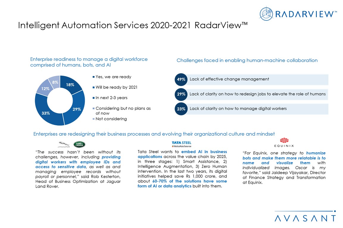 Avasant’s research and other publications are based on information from the best available sources and Avasant’s independent assessment and analysis at the time of publication. Avasant takes no responsibility and assumes no liability for any error/omission or the accuracy of information contained in its research publications. Avasant does not endorse any provider, product or service described in its RadarView™ publications or any other research publications that it makes available to its users, and does not advise users to select only those providers recognized in these publications. Avasant disclaims all warranties, expressed or implied, including any warranties of merchantability or fitness for a particular purpose. None of the graphics, descriptions, research, excerpts, samples or any other content provided in the report(s) or any of its research publications may be reprinted, reproduced, redistributed or used for any external commercial purpose without prior permission from Avasant, LLC. All rights are reserved by Avasant, LLC.