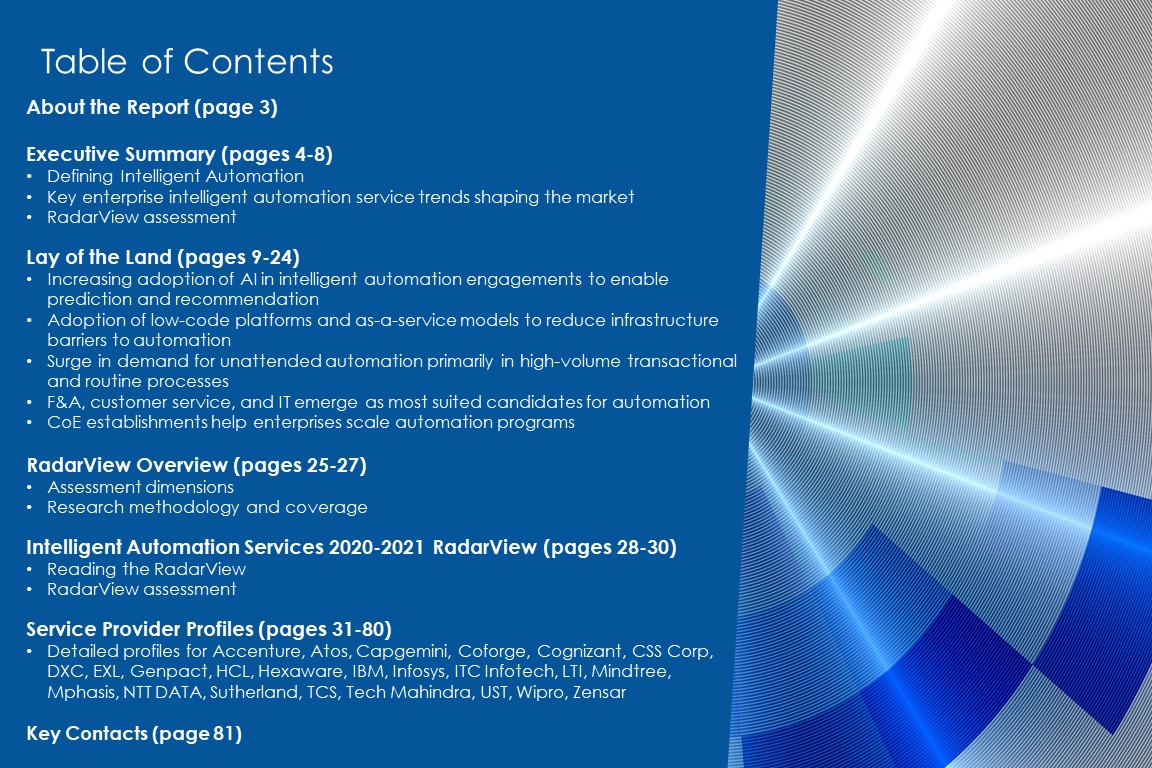 This RadarView includes an analysis of the following service providers in intelligent automation space: Accenture, Atos, Capgemini, Coforge, Cognizant, CSS Corp, DXC, EXL, Genpact, HCL, Hexaware, IBM, Infosys, ITC Infotech, LTI, Mindtree, Mphasis, NTT DATA, Sutherland, TCS, Tech Mahindra, UST, Wipro, Zensar.