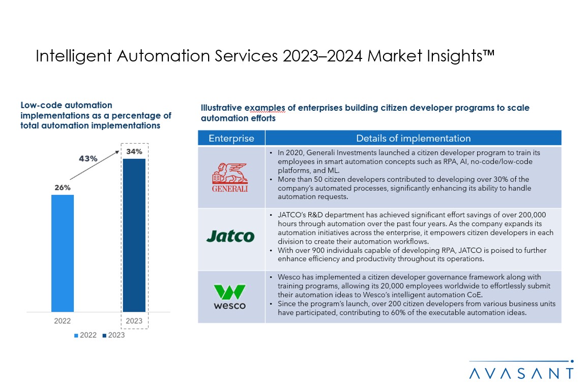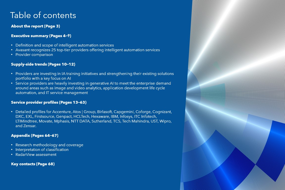 Please refer to Avasant’s Intelligent Automation Services 2023–2024 RadarView™ for detailed insights on the service providers and supply-side trends.