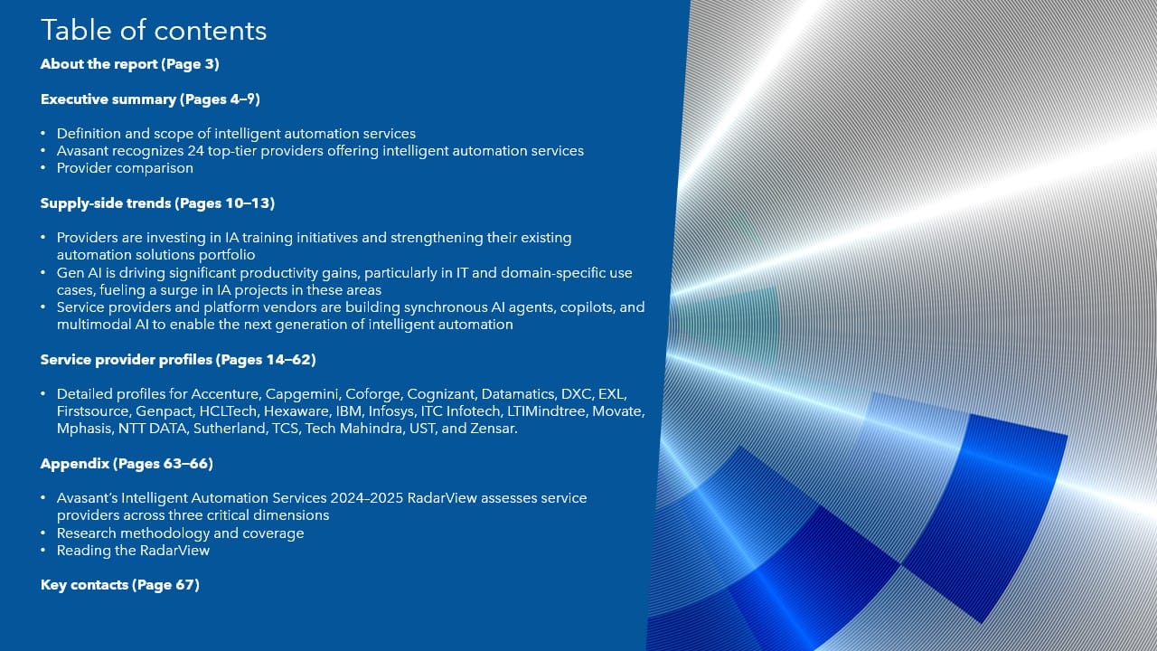 This RadarView includes a detailed analysis of the following IA service providers: Accenture, Capgemini, Coforge, Cognizant, Datamatics, DXC, EXL, Firstsource, Genpact, HCLTech, Hexaware, IBM, Infosys, ITC Infotech, LTIMindtree, Movate, Mphasis, NTT DATA, Sutherland, TCS, Tech Mahindra, UST, Wipro, and Zensar.