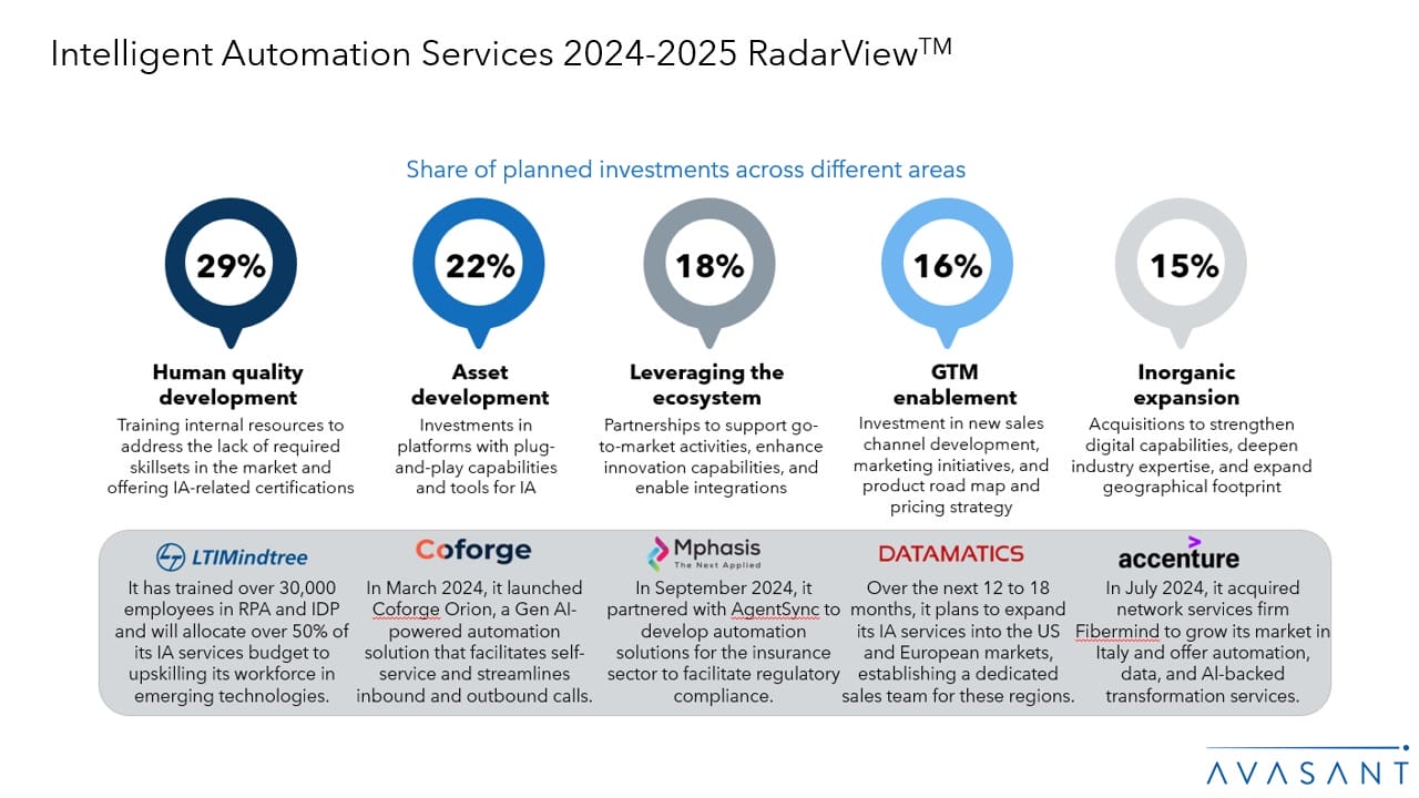 The Intelligent Automation Services 2024–2025 RadarView™ highlights key supply-side trends in this space and Avasant’s viewpoint on them. It aids companies in identifying top service providers to assist them in their IA journeys. It also analyzes each service provider’s capabilities in technology and delivery support, enabling organizations to select the right strategic partners to implement IA.