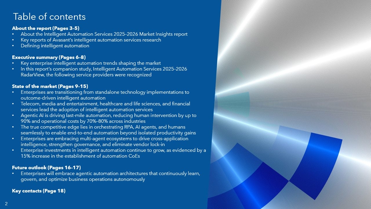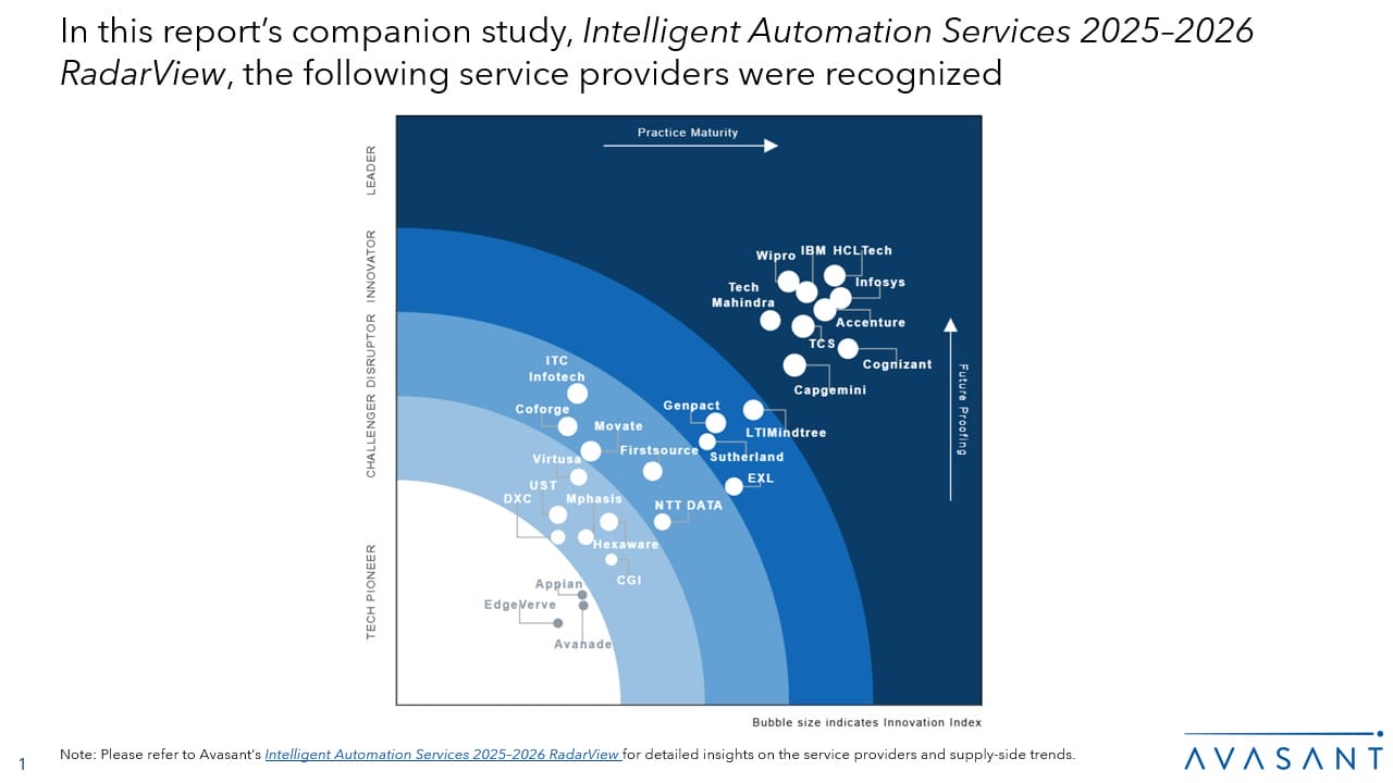 Read the Research Byte based on this report. Please refer to Avasant’s Intelligent Automation Services 2025–2026 RadarView™ for detailed insights on the service providers and supply-side trends.