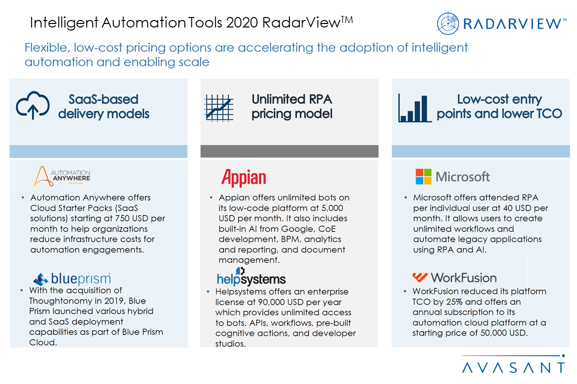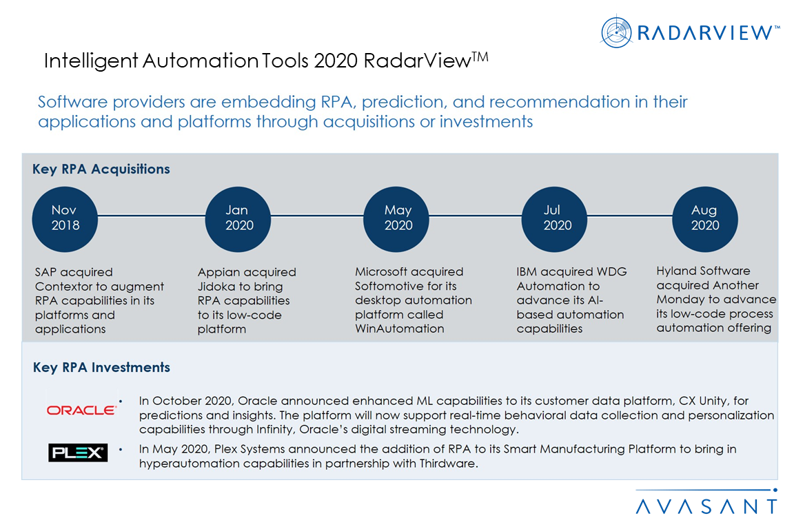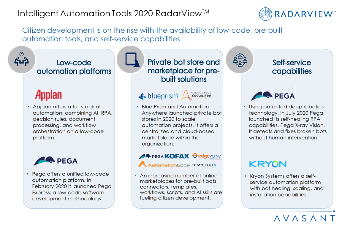 Appian, Automation Anywhere, Automation Edge, Blue Prism, EdgeVerve, Jacada, Kofax, Kryon Systems, Microsoft, NICE, Pegasystems, UiPath, Verint, WorkFusion.