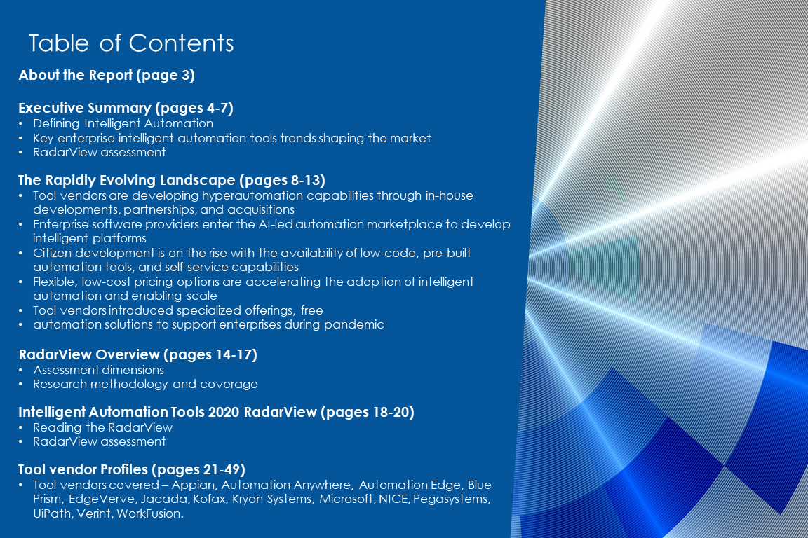 The report features highly detailed, comprehensive RadarView Profiles of the top 14 tool vendors and their intelligent automation solution offerings. This is also a reflection of how the tool vendor landscape has evolved, not only in terms of categorization but also in the way they are investing in hyperautomation capabilities, democratizing RPA, developing reusable and off-the-shelf assets, and strengthening their partner network.