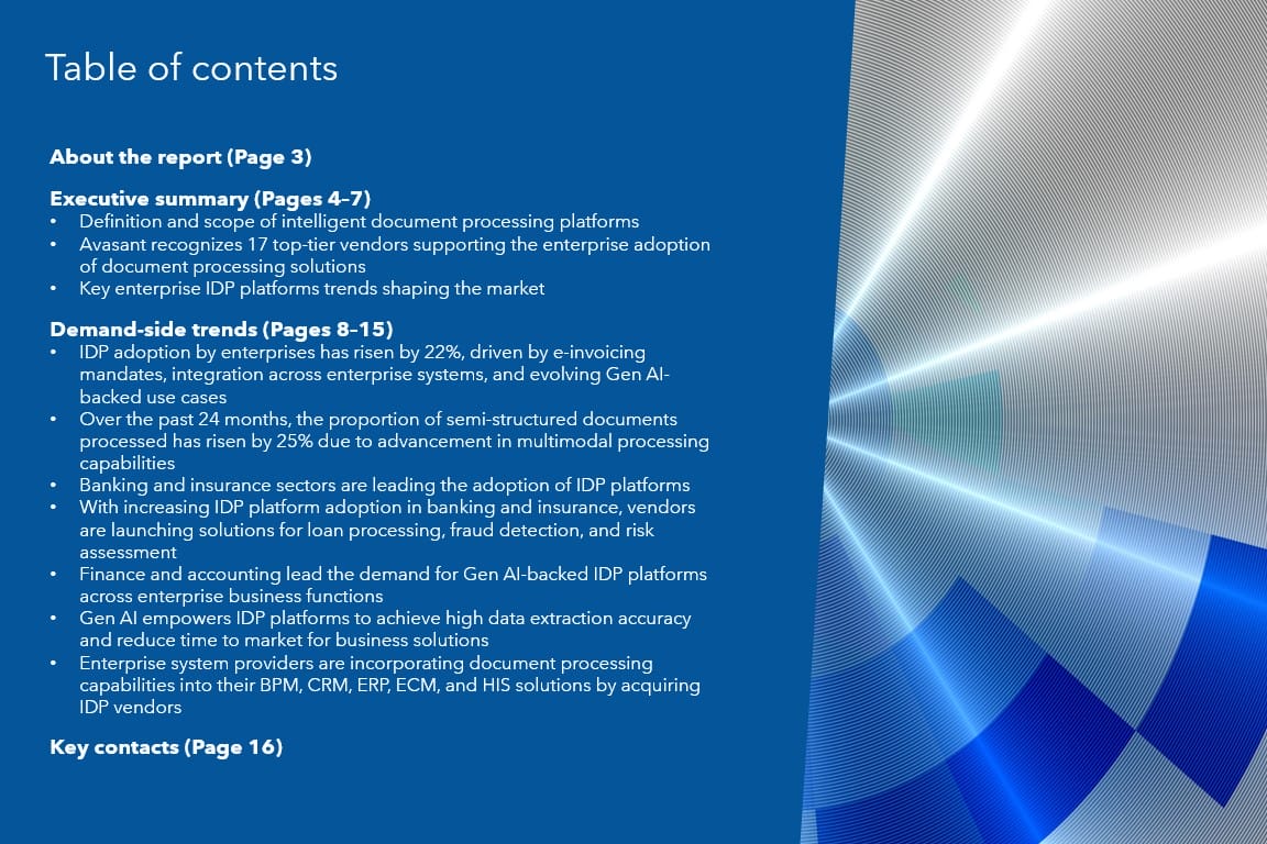 Read the Research Byte based on this report. Please refer to Avasant’s Intelligent Document Processing Platforms 2024–2025 RadarView™ for detailed insights on the platform vendors and supply-side trends.