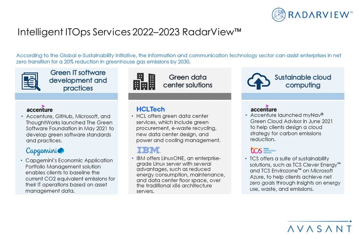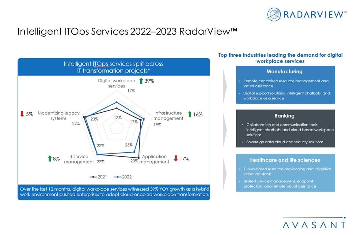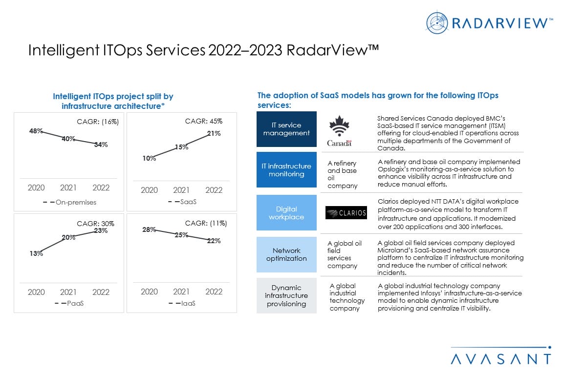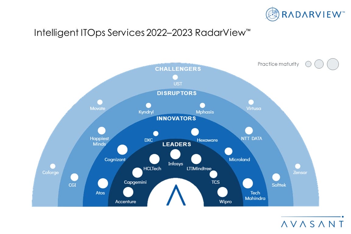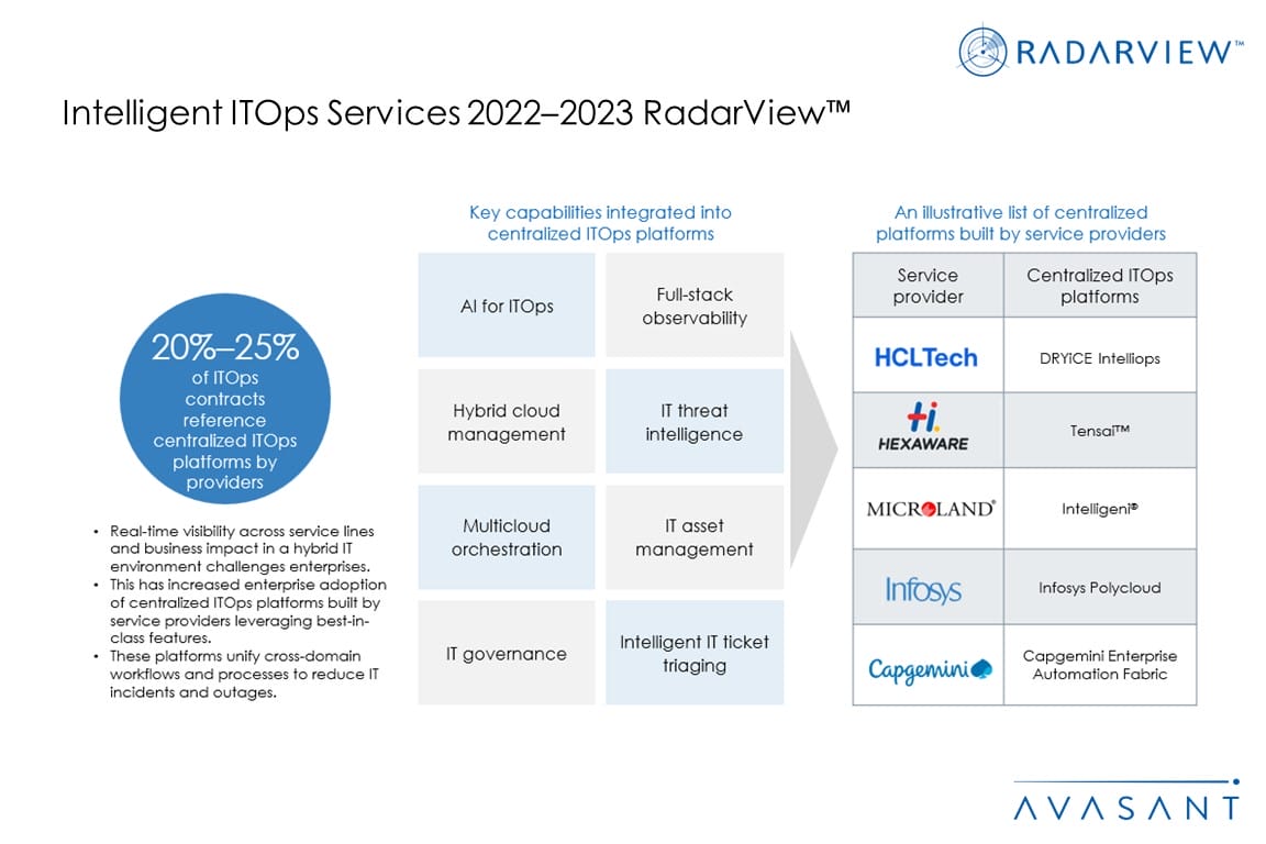 Avasant’s interactions with organizations indicate a rising need for hyper-convergence of IT capabilities to wade through the complexity of a hybrid IT environment. This has resulted in increased business adoption of centralized ITOps platforms built by service providers using a best-of-breed approach for faster deployment times, unified monitoring, and reduced platform costs. These trends, and others, are covered in our Intelligent ITOps Services 2022–2023 RadarView™.