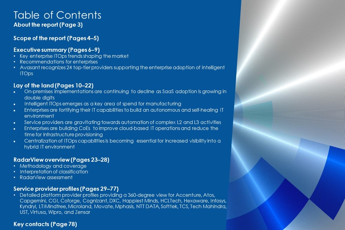 This RadarView addresses the need for enterprises to adopt intelligent ITOps services to enhance collaboration, predictability, data aggregation and correlation, anomaly detection, and compliance across the IT infrastructure. It covers key trends shaping the market and top bets made by service providers.