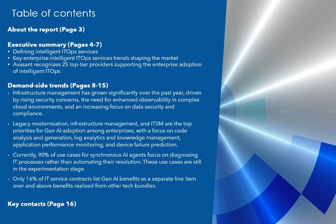 This report identifies key demand-side trends in the intelligent ITOps services space to assist enterprises in their intelligent ITOps journeys. It provides an overview of key trends and enterprise challenges that Avasant considers important to highlight in the intelligent ITOps services space.