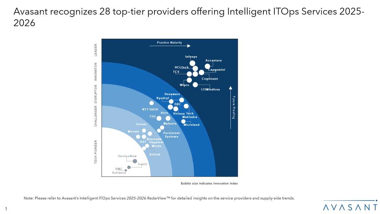 The Intelligent ITOps Services 2025-2026 RadarView™ highlights key supply-side trends in the intelligent ITOps space and Avasant’s viewpoint on them. It aids companies in identifying top service providers to assist them in implementing intelligent ITOps solutions. It also offers an analysis of each service provider’s capabilities in technology and delivery support, enabling organizations to select the right strategic partners for intelligent ITOps.