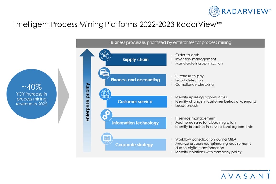 An increase in enterprise demand for hyperautomation has boosted the demand for process mining tools. However, with advancements in technology such as RPA, low-code/no-code, and AI, the role of process mining has elevated from process standardization or automation to delivering digital transformation. Sophisticated platform features such as data integration with IoT devices and digital twin development enhance process understanding and data visualization capabilities. To tap potential market opportunities, software-as-a-service (SaaS) providers are embedding process mining capabilities in business applications by developing in-house capabilities and acquiring or partnering with process mining vendors. These trends, and others, are covered in our Intelligent Process Mining Platforms 2022–2023 RadarView™.
