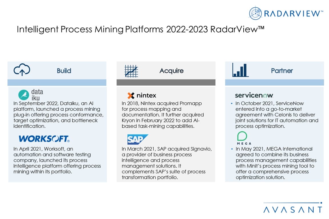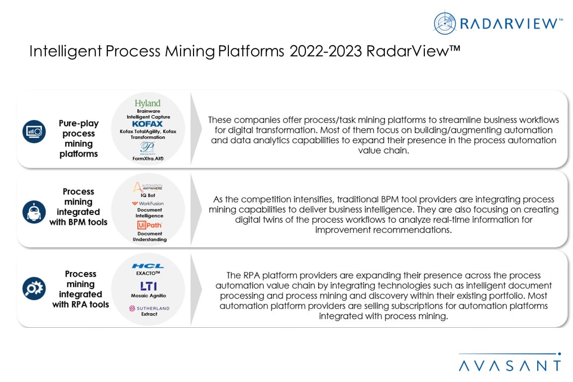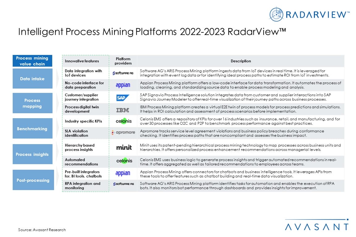 The report highlights key market trends in the intelligent process mining space and Avasant’s viewpoint. It aids companies in identifying top platform providers who can assist them in implementing process mining platforms. It also offers an analysis of each platform provider’s capabilities in technology and delivery support, thereby enabling organizations to identify the right strategic partners for process mining.