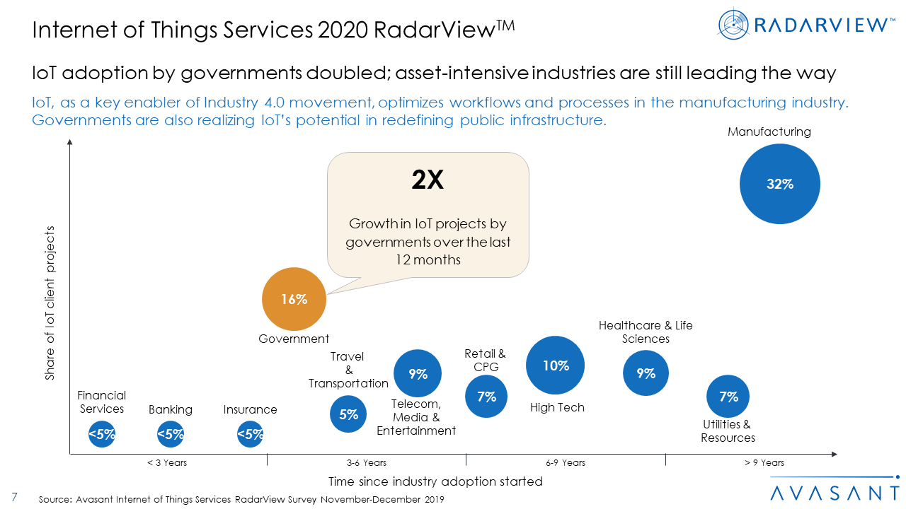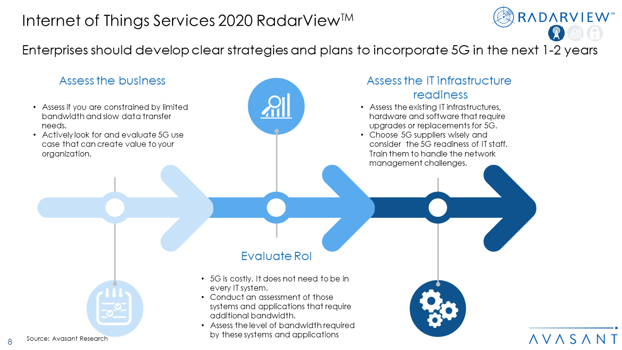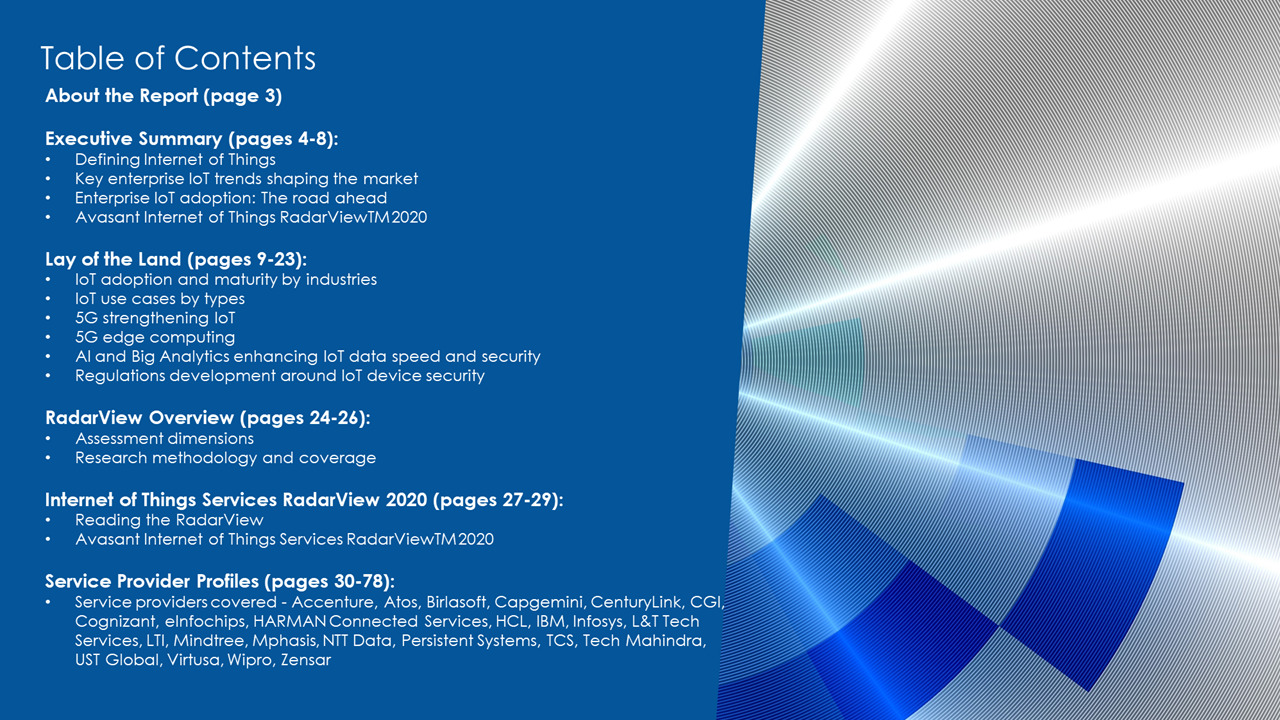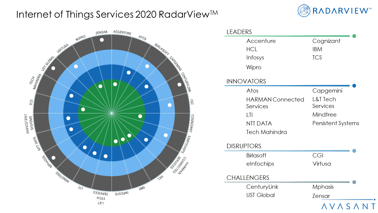The Internet of Things Services RadarView™ 2020 report highlights the key trends in the market and Avasant’s view on the road ahead for IoT over the next 18-24 months. It addresses the need of enterprises to understand the right action points to navigate through the headwinds and gain competitive advantage. It also identifies the key global service providers and system integrators that can help enterprises in business transformation.