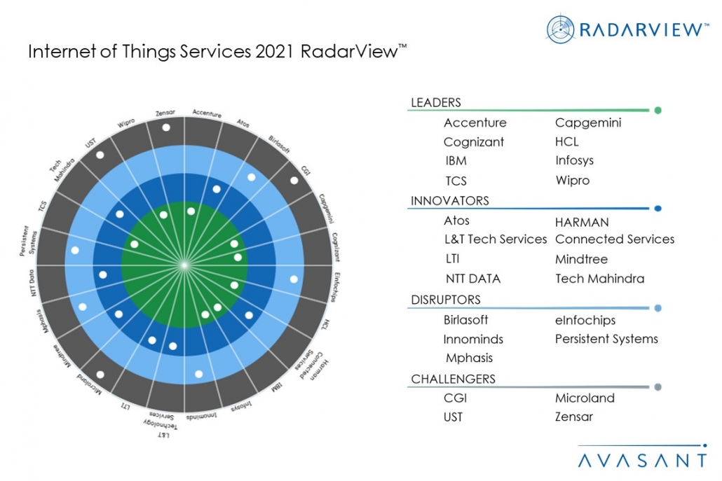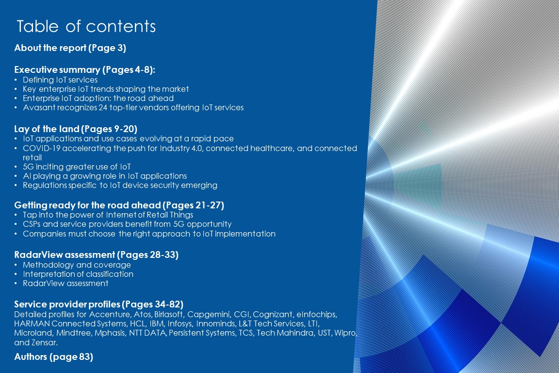 This RadarView includes an analysis of the following service providers in the IoT services space: Accenture, Atos, Birlasoft, Capgemini, CGI, Cognizant, eInfochips, HARMAN Connected Services, HCL, IBM, Infosys, Innominds, L&T Tech Services, LTI, Microland, Mindtree, Mphasis, NTT DATA, Persistent Systems, TCS, Tech Mahindra, UST, Wipro, and Zensar.