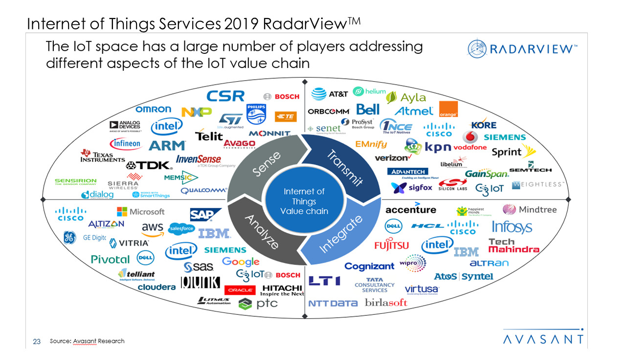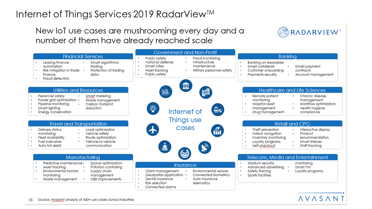 The Internet of Things Services RadarView 2019 report highlights the key trends in the market and Avasant’s view on the road ahead for IoT. It addresses the need of enterprises to understand the right action points to navigate through the headwinds and gain competitive advantage. It also identifies the key global service providers and system integrators that can help enterprises in business transformation.