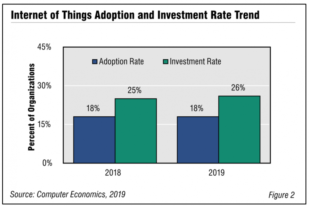 As shown in Figure 2 from our full report, Internet of Things Adoption Trends and Customer Experience, the adoption rate for IoT is 18% of all organizations in 2018 and 2019. During the same period, the percentage of organizations making new investments in IoT also is essentially flat, ticking up from 25% in 2018 to 26% in 2019. This is the second year we have included IoT in our survey, thus we have no historical data before 2018.