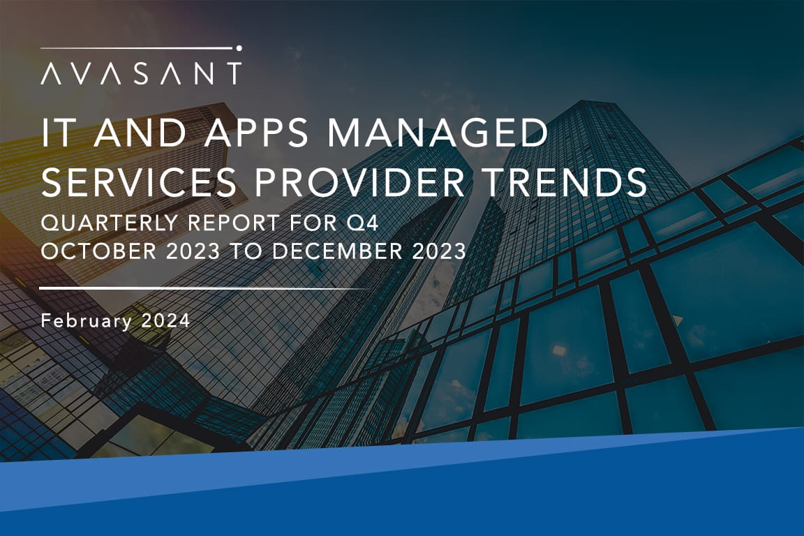 In this quarterly report, Avasant provides key information on IT and apps managed services provider trends. The report covers key information on the IT services industry and the provider ecosystem. It covers the service provider facts and figures (including revenue and resource trends), macro trends, and executive sentiment from the service provider community. The report covers trends across a gamut of IT services, including but not limited to IT infrastructure, application, and end-user services. The geographic coverage for the report is global. It builds on insights gathered through ongoing market research, data collection, and proprietary databases. It includes market data from providers accessed through multiple sources such as public disclosures, market interactions, and deals data.