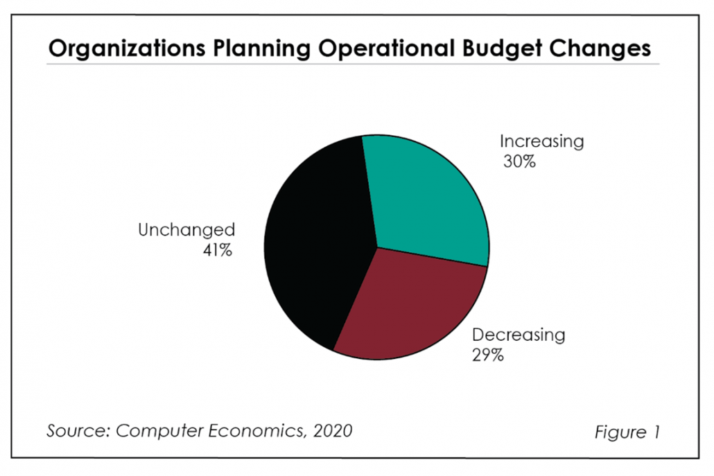 As seen in Figure 1 from our full report, Revisiting the Impact of COVID-19 on IT Organizations in 2020, 30% of respondents reported that they are increasing their IT operational budgets in response to the pandemic. Around 29% are decreasing their budgets, and 41% are leaving budgets unchanged.