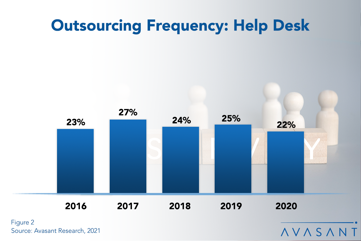 The decision to turn over an IT organization’s help desk function to a service provider has a long and varied history. It is one of the services that helped establish the contemporary IT outsourcing industry. Even so, our research shows that help desk outsourcing is not as pervasive as one might think. In this report, we analyze the percentage of organizations outsourcing help desk (frequency), the average amount of work outsourced (level), and the change in the amount of work being outsourced (trend). We also present data on cost and service experience and on how these trends differ by organization size and sector. We conclude with some key questions to consider. (17 pp., 8 fig.)