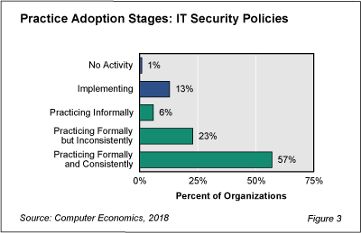 As shown in Figure 3 from our full report, IT Security Policies Adoption and Best Practices, 57% of survey respondents have formal security policies that they follow consistently (the maturity level). Twenty-three percent of respondents have formal security policies but follow them inconsistently.