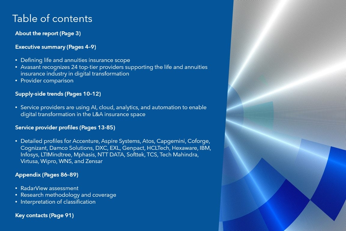 This RadarView helps life and annuities (L&A) insurance enterprises craft a robust strategy based on industry outlook, best practices, and digital transformation. It begins with a summary of key trends shaping the supply side of the market. It continues with a detailed assessment of 24 providers offering digital services in the L&A insurance industry. Each profile provides an overview of the service provider, its industry-specific solutions, and a list of representative clients and partnerships, along with brief client case studies. Each profile concludes with analyst insights on the provider’s practice maturity, investments and innovation, and partner ecosystem.