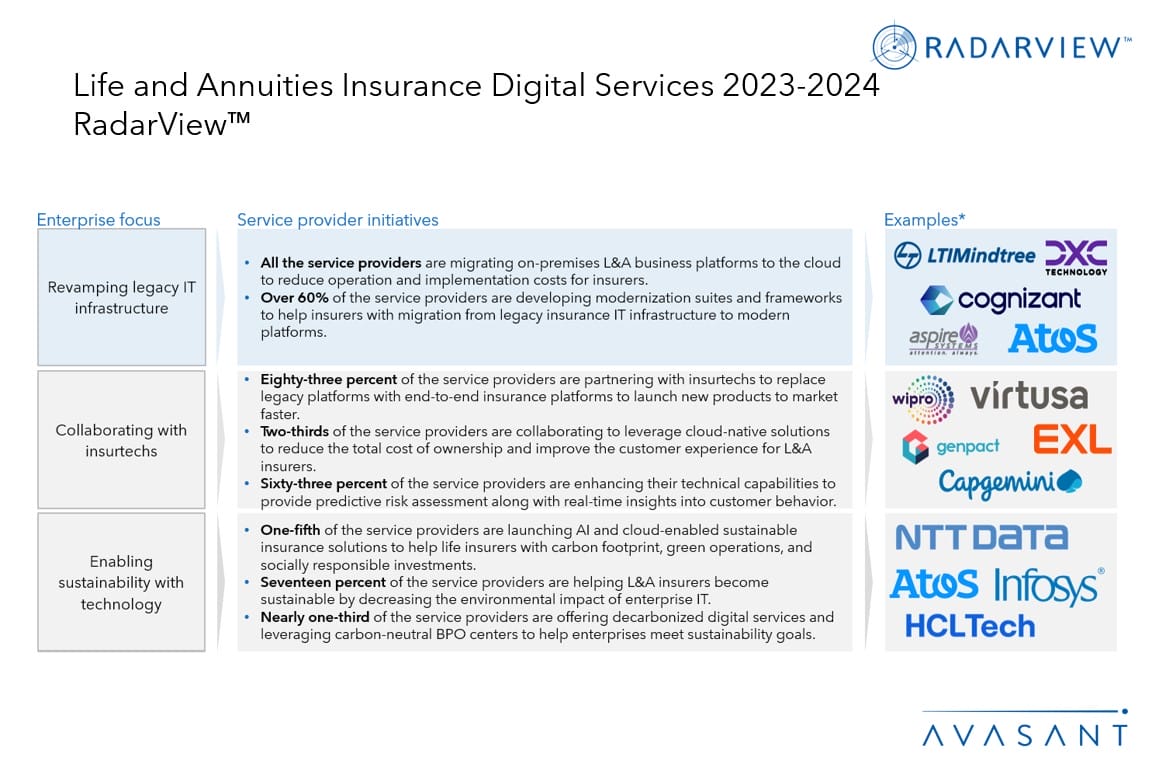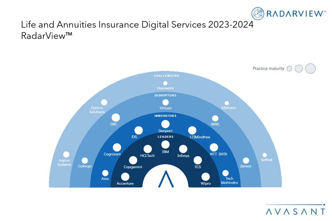 The Life and Annuities Insurance Digital Services 2023–2024 RadarView™ highlights key supply-side trends in the L&A insurance space and Avasant’s viewpoint on them. It aids companies in identifying top service providers to assist them in the digital transformation of their L&A insurance offerings. It also analyzes each service provider’s capabilities in technology and delivery support, enabling organizations to identify the right strategic partners.