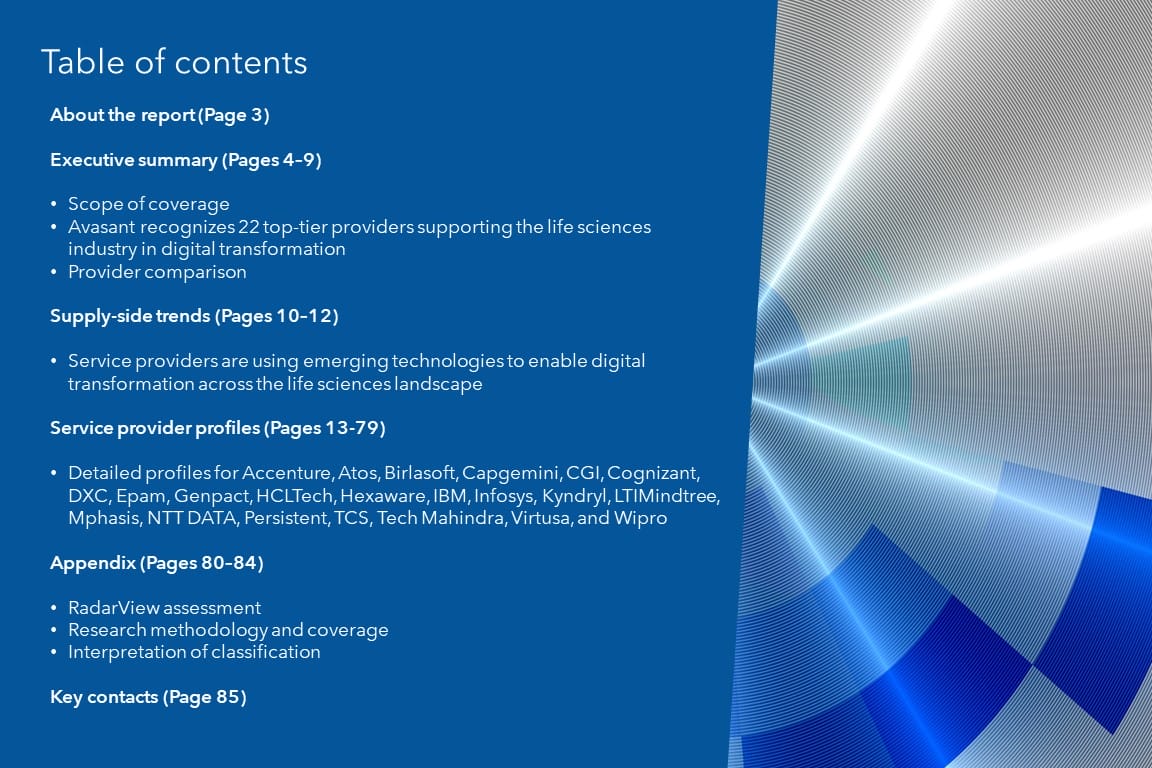 This RadarView includes a detailed analysis of the following service providers: Accenture, Atos, Birlasoft, Capgemini, CGI, Cognizant, DXC, Epam, Genpact, HCLTech, Hexaware, IBM, Infosys, Kyndryl, LTIMindtree, Mphasis, NTT DATA, Persistent, TCS, Tech Mahindra, Virtusa, and Wipro.