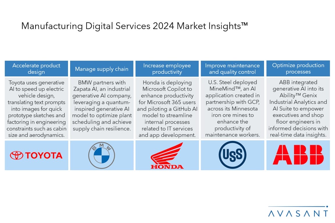 The manufacturing industry is increasingly adopting smart factory practices for efficiency and driving sustainability by facilitating the transition to circular operations and emissions reduction through partnerships. Manufacturers are prioritizing resilient supply chains with investments in data-driven inventory management and reshoring initiatives. They are using advanced technologies such as generative AI for product design acceleration and are transitioning to experience-based offerings using IoT, AI, and 3D printing to meet evolving customer needs. Additionally, investments in connected solutions and facility modernization highlight their commitment to a safer, more productive work environment. Manufacturing enterprises collaborate with service providers for digital transformation, which requires strong technological expertise and delivery capabilities.