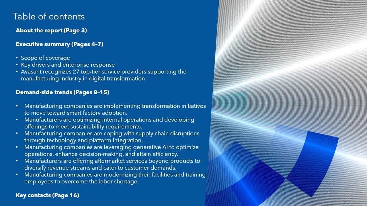This report identifies key demand-side trends in the manufacturing industry that can help enterprises fine-tune their digital strategies. It also provides an overview of enterprise challenges in this space based on Avasant’s assessment.