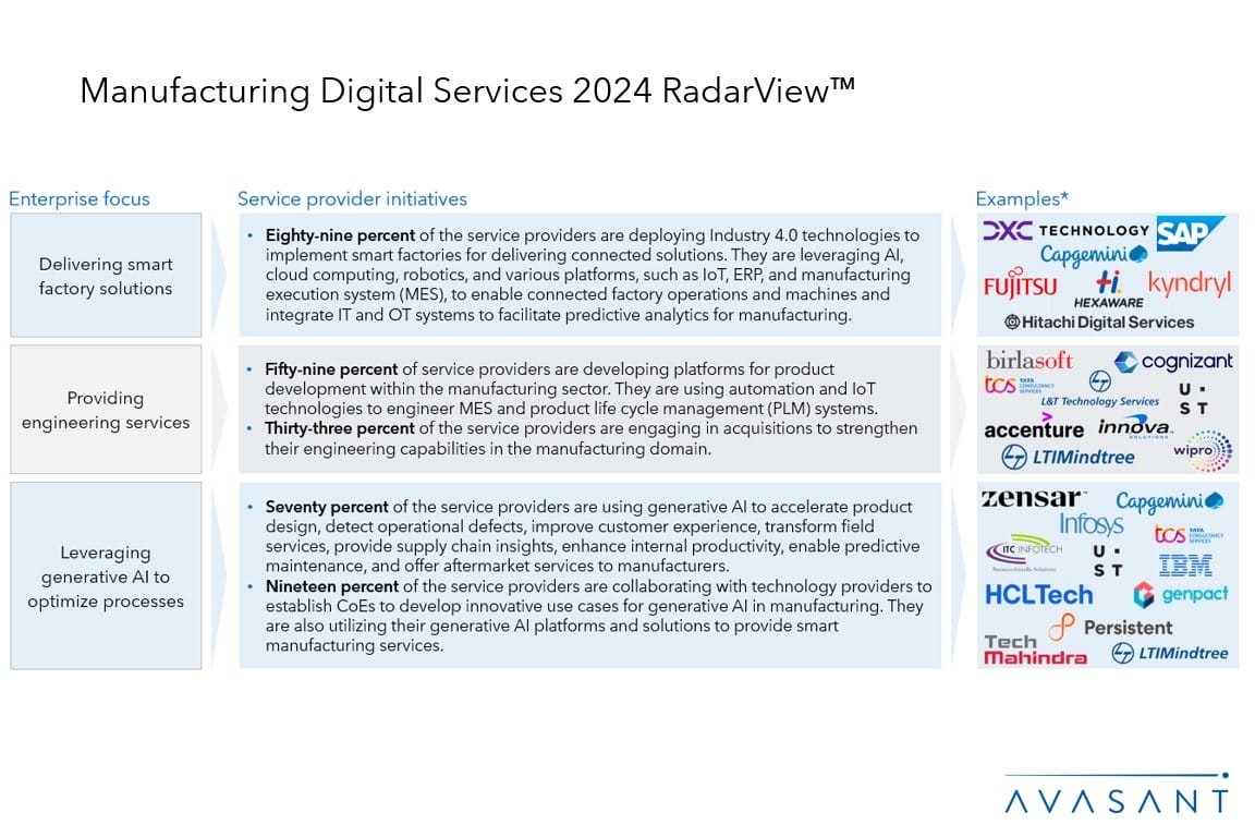 The Manufacturing Digital Services 2024 RadarView™ highlights key supply-side trends in the manufacturing industry and Avasant’s viewpoint. It aids companies in identifying top service providers to assist them in the digital transformation of their offerings for this sector. It also analyzes each service provider’s capabilities in technology and delivery support, enabling organizations to identify the right strategic partners.