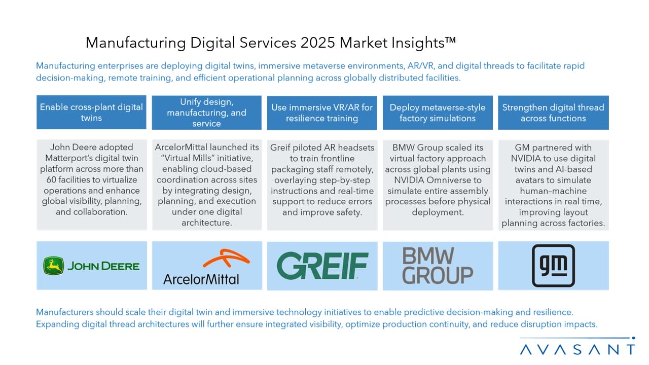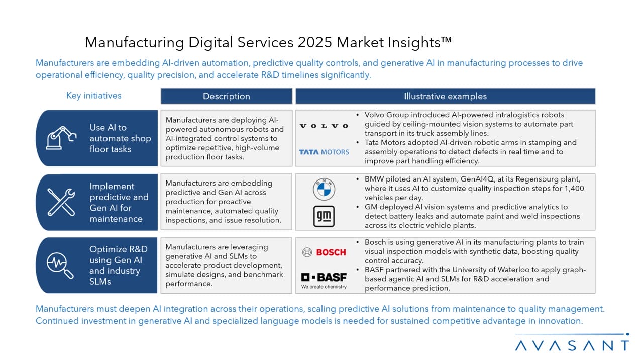 Manufacturing enterprises are accelerating digital transformation by embedding agentic and predictive AI across production lines for quality control, maintenance, and R&D optimization. To enhance resilience and operational planning, they are adopting digital twins, immersive simulations, and AR/VR-enabled digital threads across design and service stages. Platform-led modernization is gaining traction through low-code industrial IoT (IIoT) platforms, AI-powered edge, and cloud-based manufacturing execution systems (MES) for real-time visibility and centralized decision-making. Human-machine collaboration is also expanding, with investments in Industry 5.0 technologies such as wearables, voice AI, and collaborative robotics to improve safety and productivity. In parallel, enterprises are strengthening supply chain resilience and sustainability using blockchain, AI, micro factories, and circular manufacturing practices to meet traceability and ESG goals. Manufacturing companies collaborate with service providers for this digital transformation, which requires strong technological expertise and delivery capabilities.