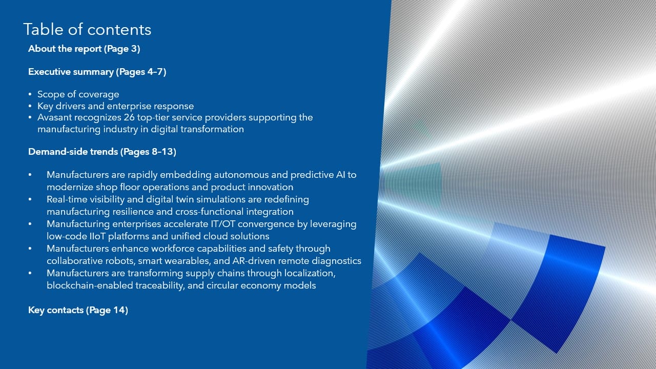 Read the Research Byte based on this report. Please refer to Avasant’s Manufacturing Digital Services 2025 RadarView™ for detailed insights on the service providers and supply-side trends.