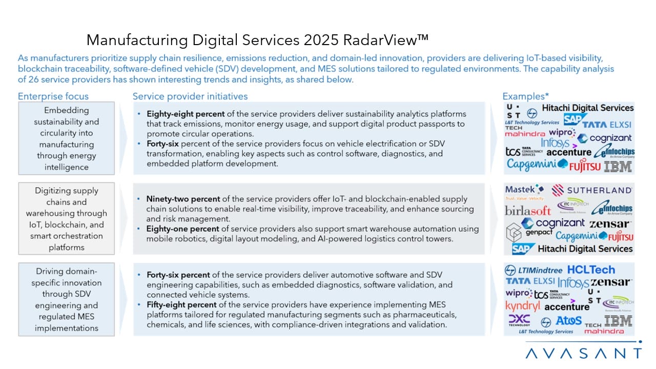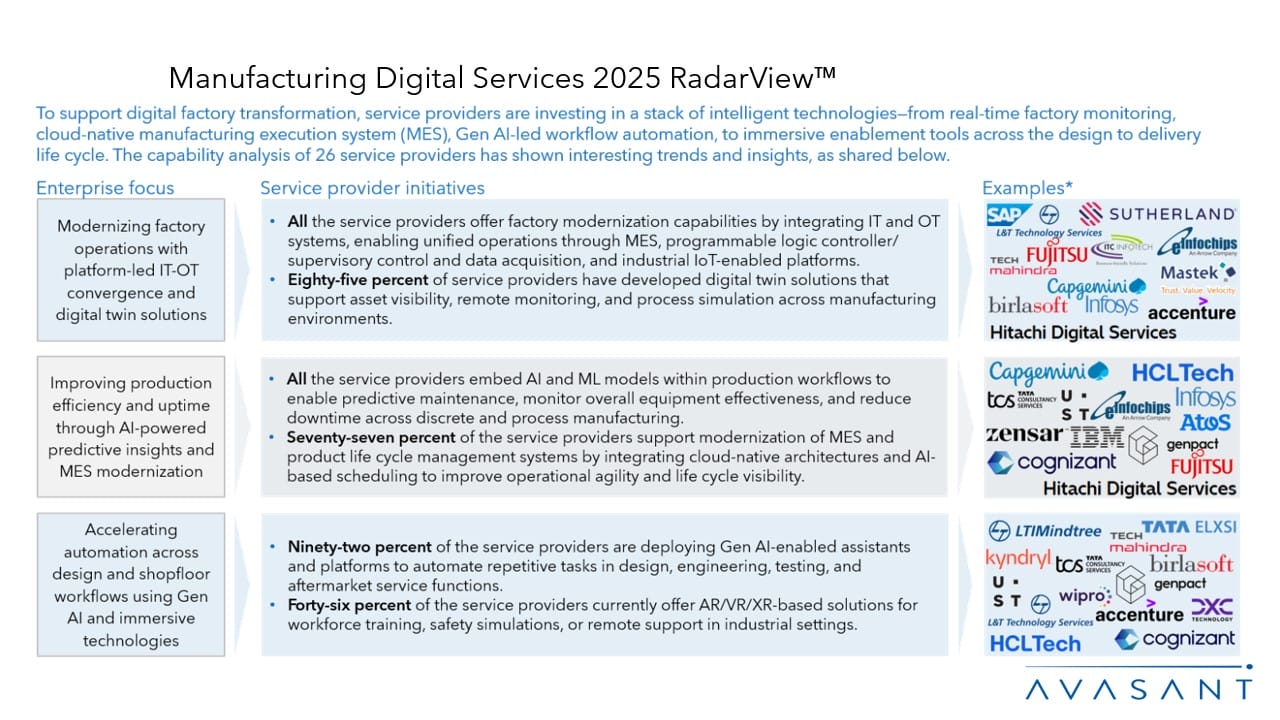 The Manufacturing Digital Services 2025 RadarView™ highlights key supply-side trends in the manufacturing industry and Avasant’s viewpoint on them. It aids companies in identifying top service providers to assist them in the digital transformation of their offerings for this sector. It also analyzes each service provider’s capabilities in technology and delivery support, enabling organizations to identify the right strategic partners.