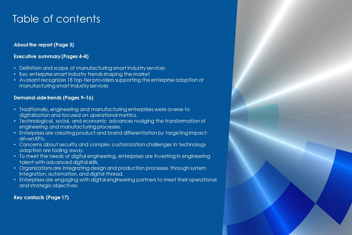 This report identifies key demand-side trends in the manufacturing smart industry services space, helping enterprises fine-tune their engineering and manufacturing transformation strategies. It provides an overview of key observations and enterprise challenges that Avasant considers important to highlight in the smart industry services space.
