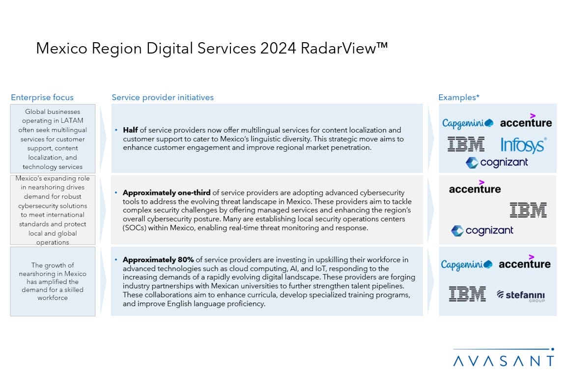 The Mexico Region Digital Services 2024 RadarView™ highlights key supply-side trends in the Mexico region and Avasant’s viewpoint on them. It aids companies in identifying top service providers to assist in the digital transformation of their offerings for this region. It also analyzes each service provider’s capabilities in technology and delivery support, enabling organizations to identify the right strategic partners.