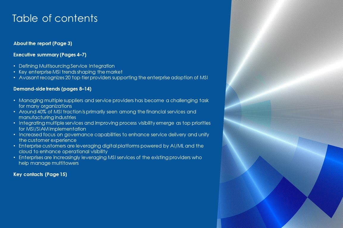 This report identifies key demand-side trends in the multisourcing service integration (MSI) services space, helping enterprises fine-tune their MSI strategies. This report identifies key demand-side trends in the multisourcing service integration (MSI) services space, helping enterprises fine-tune their MSI strategies. It consists of key trends and enterprise challenges that Avasant sees as important to be highlighted in the MSI services space.