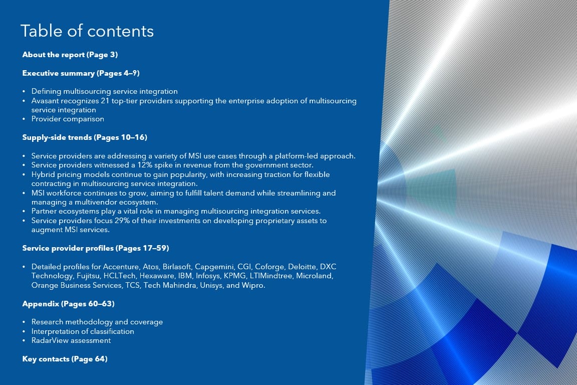 This RadarView includes a detailed analysis of the following MSI service providers: Accenture, Atos, Birlasoft, Capgemini, CGI, Coforge, Deloitte, DXC Technology, Fujitsu, HCLTech, Hexaware, IBM, Infosys, KPMG, LTIMindtree, Microland, Orange Business Services, TCS, Tech Mahindra, Unisys, and Wipro.