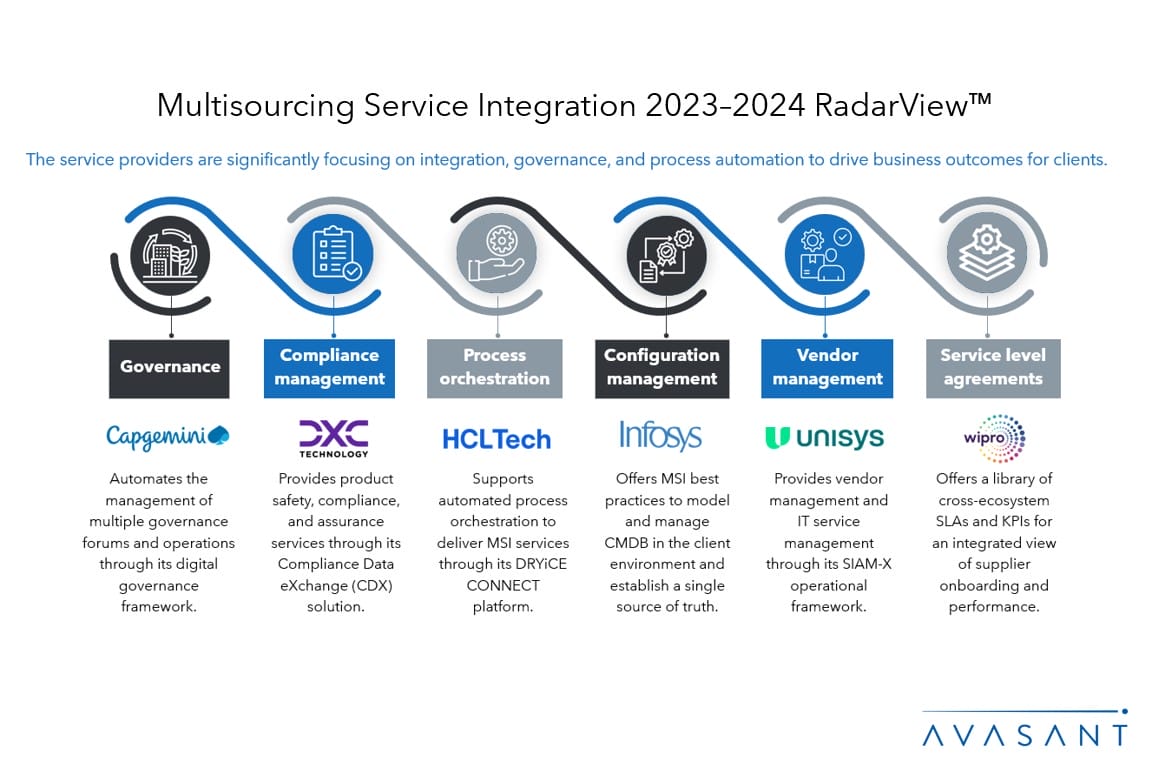 The Multisourcing Service Integration 2023–2024 RadarView™ highlights key supply-side trends in the MSI space and Avasant’s viewpoint on them. It aids companies in identifying top service providers to assist them in adopting MSI services. It also analyzes each service provider’s technology and delivery support capabilities, enabling organizations to identify the right strategic partners for managing their multivendor IT landscape.