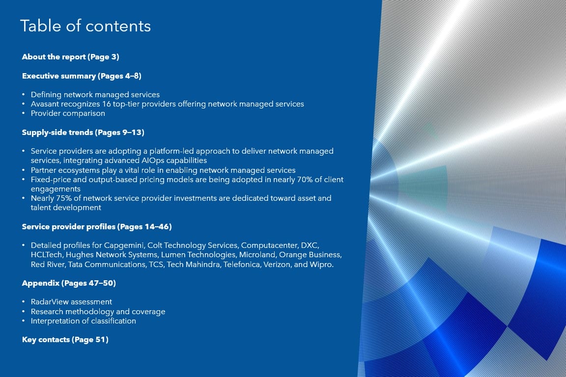 This RadarView includes a detailed analysis of the following network managed service providers: Capgemini, Colt Technology Services, Computacenter, DXC, HCLTech, Hughes Network Systems, Lumen Technologies, Microland, Orange Business, Red River, Tata Communications, TCS, Tech Mahindra, Telefonica, Verizon, and Wipro.