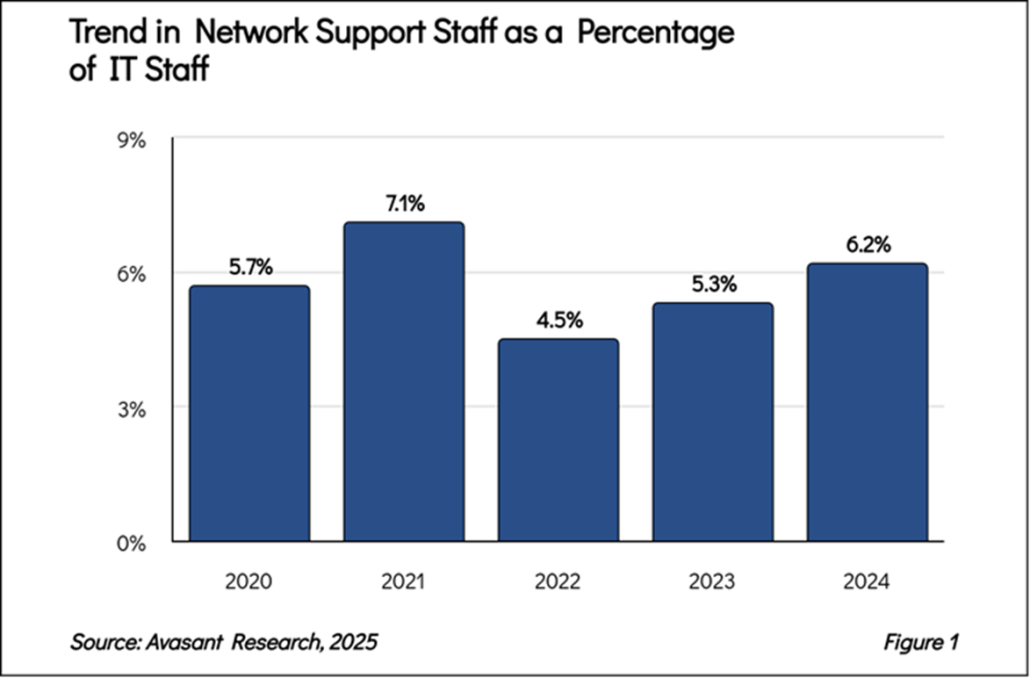 As shown in Figure 1 from our full report, Network Support Staffing Ratios, network support staffing has resumed its upward trend after a significant decrease in 2022. The ratio increased from 5.3% in 2023 to 6.2% in 2024.