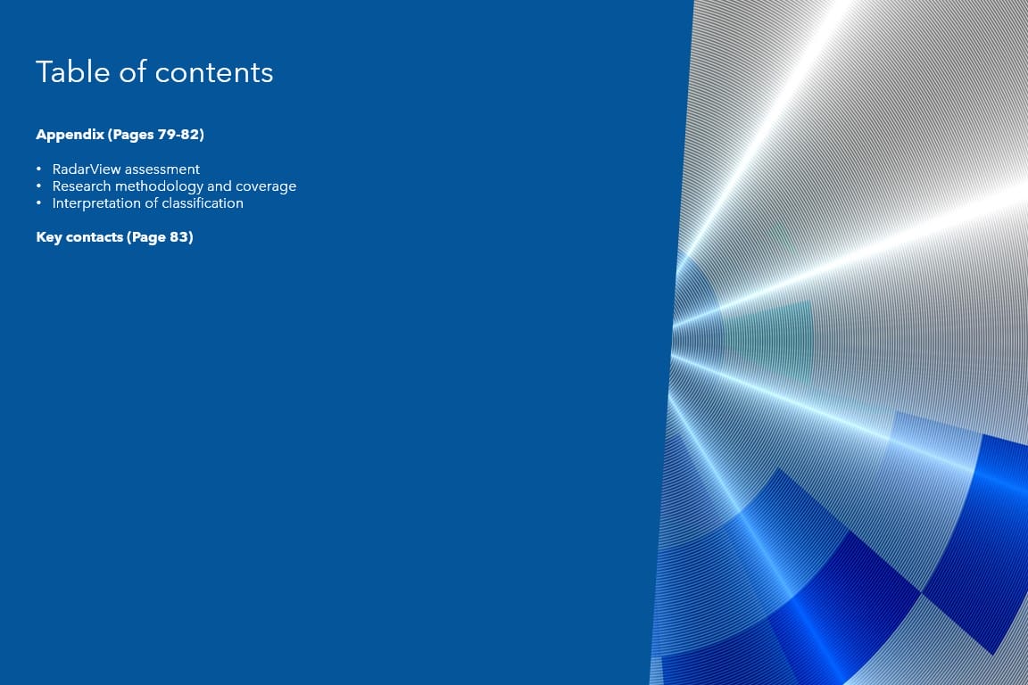 Avasant’s research and other publications are based on information from the best available sources and Avasant’s independent assessment and analysis at the time of publication. Avasant takes no responsibility and assumes no liability for any error/omission or the accuracy of information contained in its research publications. Avasant does not endorse any provider, product or service described in its RadarView™ publications or any other research publications that it makes available to its users, and does not advise users to select only those providers recognized in these publications. Avasant disclaims all warranties, expressed or implied, including any warranties of merchantability or fitness for a particular purpose. None of the graphics, descriptions, research, excerpts, samples or any other content provided in the report(s) or any of its research publications may be reprinted, reproduced, redistributed or used for any external commercial purpose without prior permission from Avasant, LLC. All rights are reserved by Avasant, LLC.