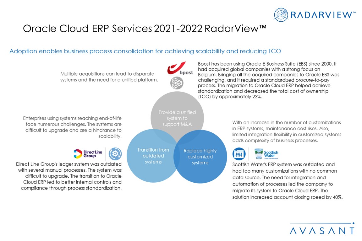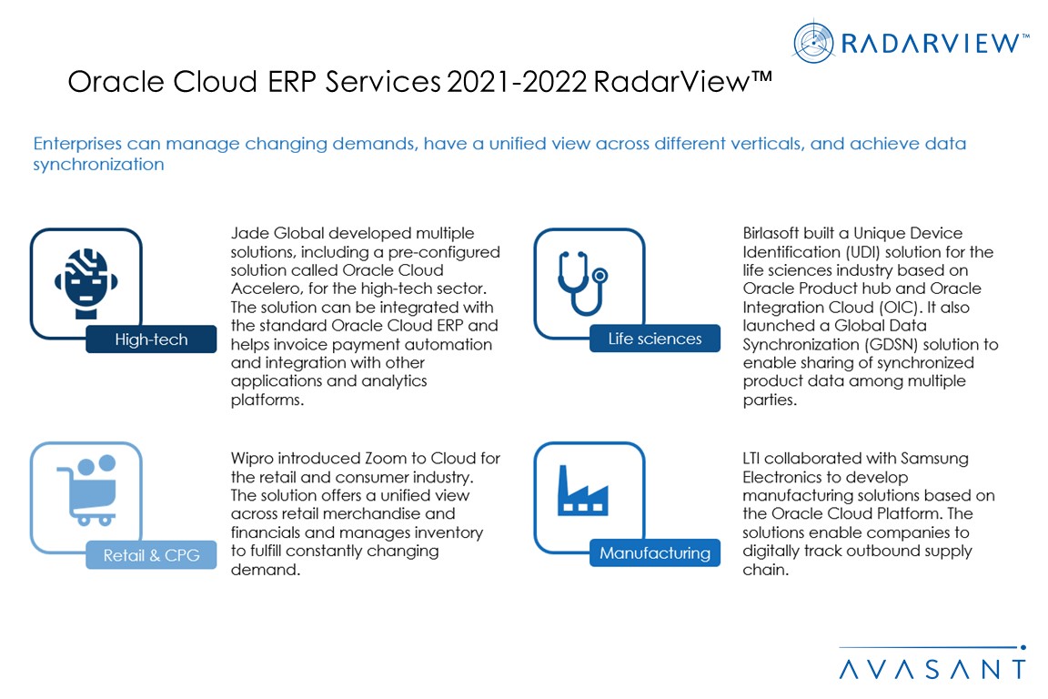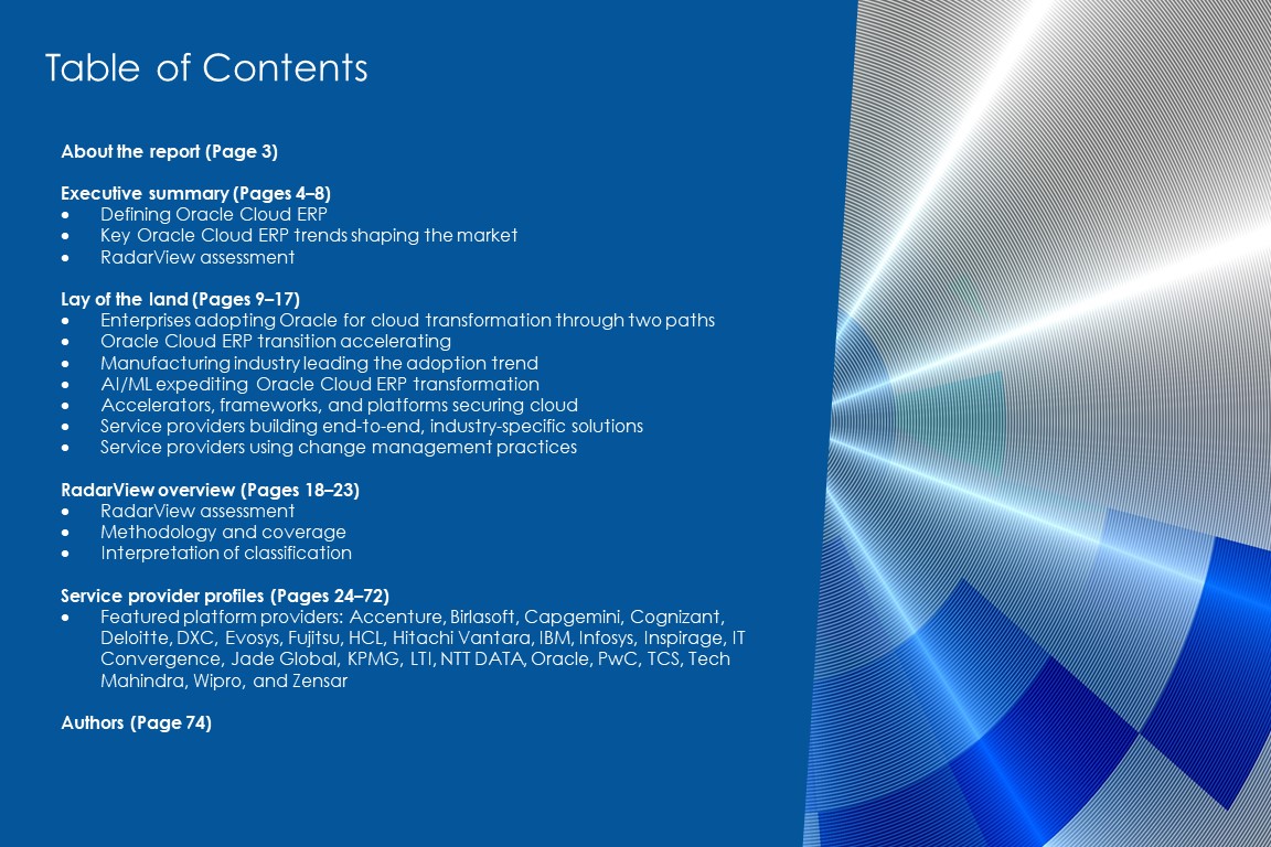 This RadarView includes a detailed analysis of the following Oracle Cloud ERP service providers: Accenture, Birlasoft, Capgemini, Cognizant, Deloitte, DXC, Evosys, Fujitsu, HCL, Hitachi Vantara, IBM, Infosys, Inspirage, IT Convergence, Jade Global, KPMG, LTI, NTT DATA, Oracle, PwC, TCS, Tech Mahindra, Wipro, and Zensar.