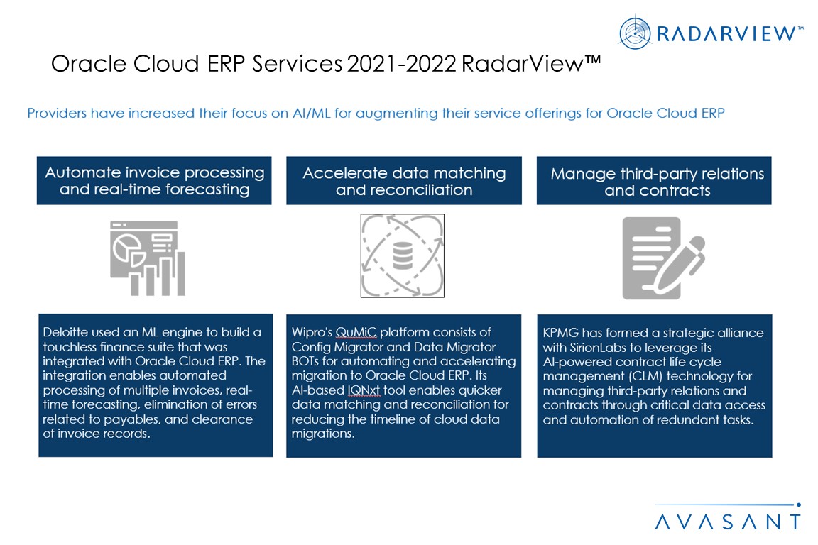 The report features RadarView profiles of 24 service providers, including their solutions, offerings, and experience assisting enterprises in their digital transformation journeys. Oracle Cloud ERP helps enterprises consolidate business processes, improve supply chain visibility, reduce downtime, and automate redundant processes. Artificial intelligence/machine learning (AI/ML) is being leveraged to develop tools, platforms, and solutions integrated with Oracle Cloud ERP to address use cases such as forecasting in real time, eliminating payable errors, and clearing multiple invoices.