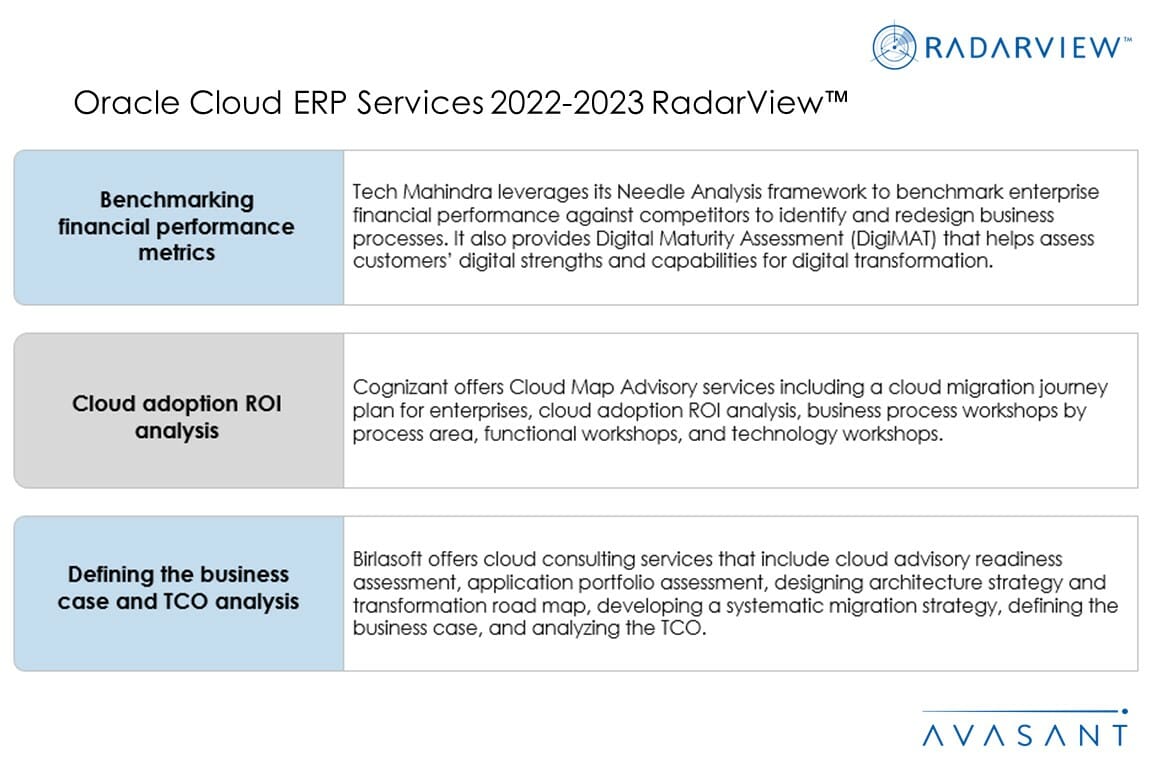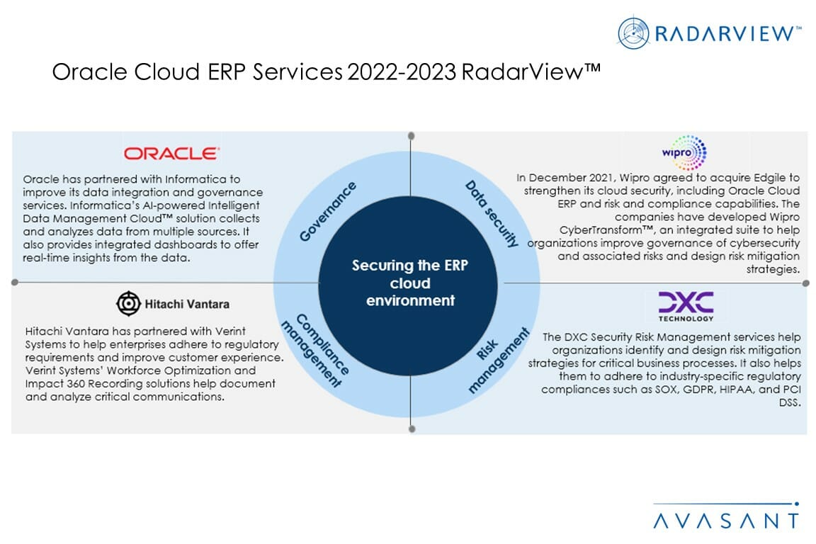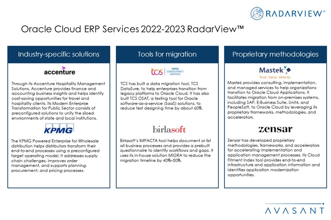 This RadarView includes a detailed analysis of the following Oracle Cloud ERP service providers: Accenture, Birlasoft, Capgemini, Cognizant, Deloitte, DXC, Fujitsu, HCL, Hexaware, Hitachi Vantara, IBM, Infosys, Inoapps, Inspirage, IT Convergence, Jade Global, KPMG, LTI, Mastek, NTT DATA, Oracle, PwC, TCS, Tech Mahindra, Wipro, and Zensar.
