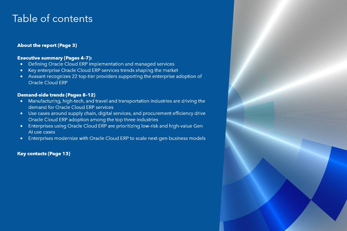 The Oracle Cloud ERP Services 2024–2025 Market Insights™ provides a view into important market trends and developments to help build a granular understanding of the Oracle Cloud ERP ecosystem.