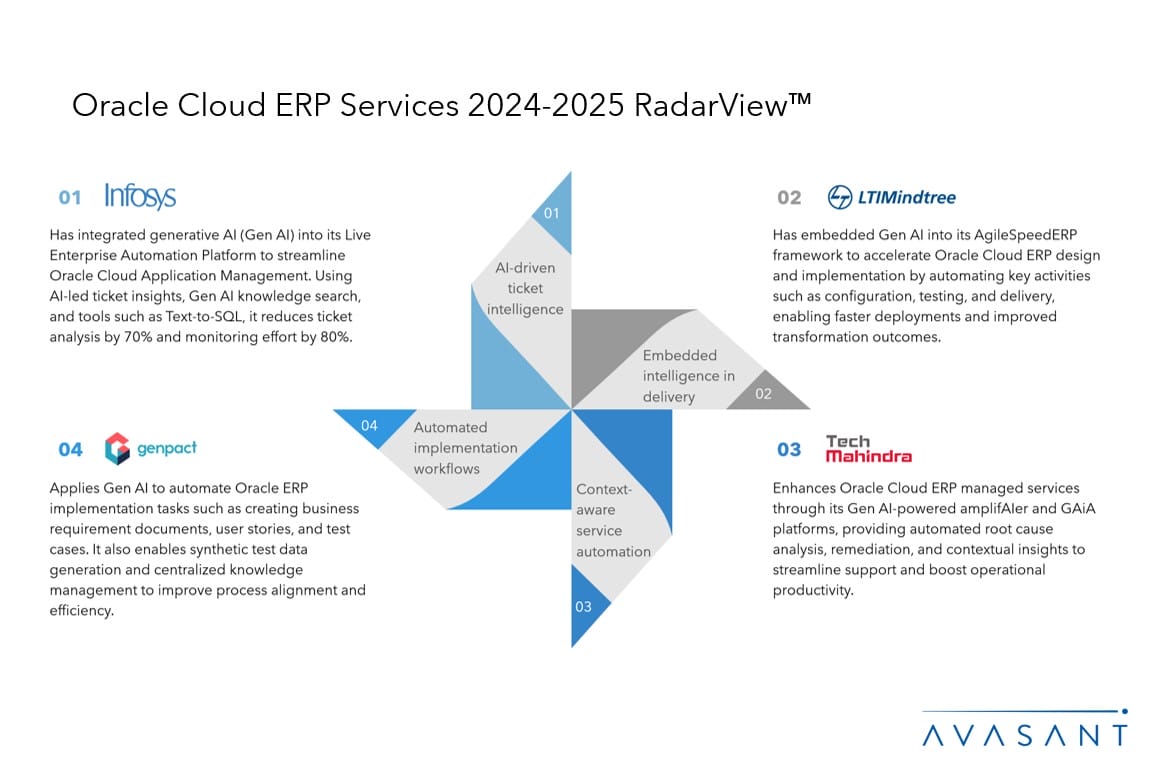 The Oracle Cloud ERP Services 2024–2025 RadarView™ aids companies in identifying top service providers to transform their ERP systems. It also analyzes each service provider’s technology and delivery capabilities, thus enabling organizations to identify the right strategic partners for their business transformation with Oracle Cloud ERP.